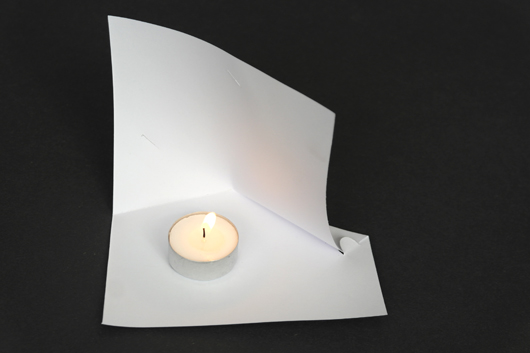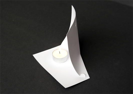 „This is a candle-holder which has a place to hold a picture or card with words on it. When lightened by the candle, the memory or the expression might be able to get closer to your heart. The product uses and represents the two qualities of paper, flexibility, which is shown in the soft, organic surface, and solidity, as you can see, being merely a slim slice of paper, it supports itself individually. Saluting to the Bauhaus spirit of industrial designing, the product was designed to be easily manufactured (it is merely one piece of paper) and when sold to customers, easily assembled.“ Xu, Zhang